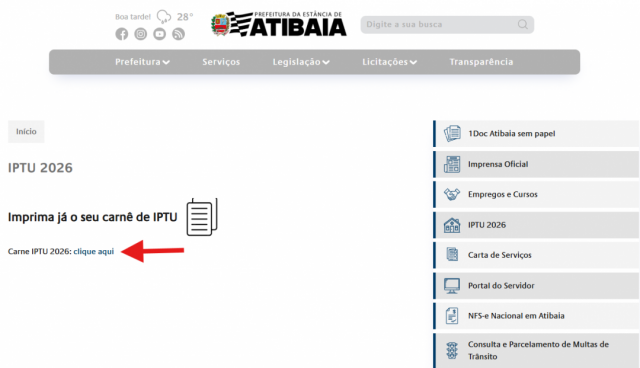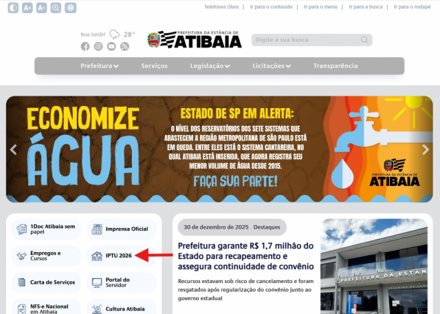 Para realizar a consulta, basta acessar o site oficial do município, www.atibaia.sp.gov.br, e clicar no link IPTU 2026, conforme imagem abaixo.
