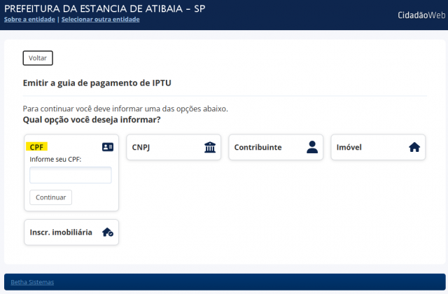 Após esse procedimento, o sistema redireciona para uma página onde é possível consultar o IPTU do(s) imóvel(is) por meio de diferentes dados, como CPF, CNPJ, Código do Contribuinte, Código do Imóvel ou Inscrição Imobiliária.
