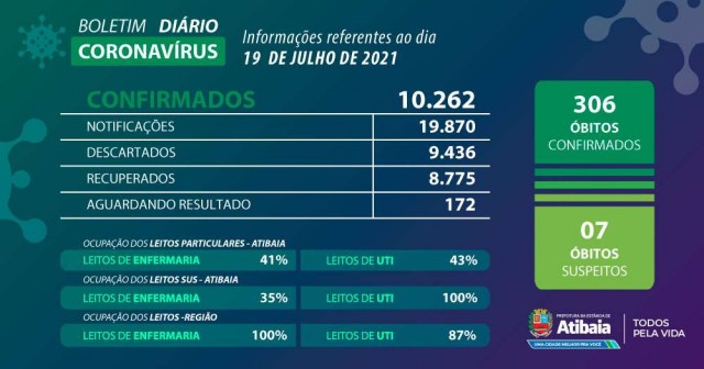 Atibaia registrou 3 mortes e 27 novos casos de Covid-19 nesta segunda-feira, dia 19 de julho, contabilizando 306 mortes devido à doença e 10.262 casos confirmados desde o início da pandemia. De acordo com os dados divulgados pela Secretaria Municipal de Saúde, o 304º óbito registrado foi de um homem de 90 anos, com doença de base. Ele foi internado na enfermaria do Hospital Novo Atibaia no dia 3 de julho e faleceu no dia 16. As mortes de duas mulheres, com 47 e 75 anos de idade, ambas com doença de base, foram o 305º e 306º óbitos confirmados no município. As duas mulheres foram internadas UTI do Hospital Novo Atibaia – a mulher de 47 anos no dia 5 de julho e a idosa de 75 anos no último dia 10 – e faleceram no domingo (18).