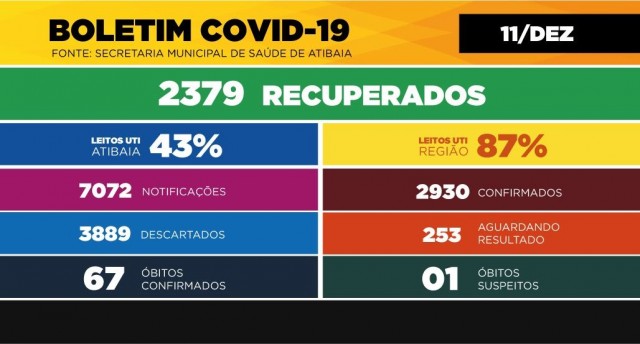 A segunda semana de dezembro se encerra com o total de 2.930 casos positivos de Coronavírus registrados em Atibaia desde o início da pandemia. Nesta sexta-feira (11) foram confirmados 22 novos casos, dos quais 10 estão em isolamento domiciliar, 6 encontram-se assintomáticos, 5 já estão recuperados e 1 está internado na enfermaria da Santa Casa de Bragança Paulista. Até o momento, foram 7.072 notificações, 3.889 suspeitas descartadas, 2.379 recuperados e 67 óbitos confirmados. Estão em análise 253 exames e 1 óbito considerado suspeito.