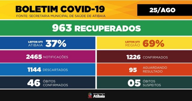 Hoje, estão internados 38 pacientes de Atibaia com Coronavírus ou suspeita da doença. Destes, 20 estão em enfermarias (três no Hospital Bragantino, dois no Hospital Albert Sabin, 12 no Hospital Novo Atibaia, um na Santa Casa de Atibaia e dois na Santa Casa de Bragança Paulista) e 18 em UTIs (dois no Hospital Bragantino, um no Hospital Albert Sabin, oito no Hospital Novo Atibaia, quatro no Hospital Universitário São Francisco e três na Santa Casa de Bragança Paulista).